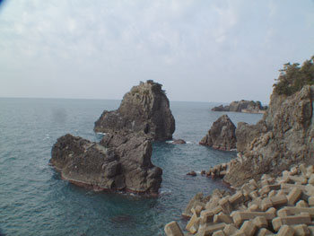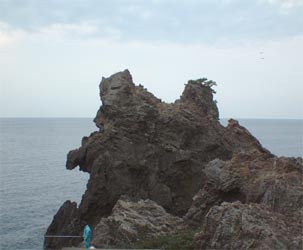 駐車場左側に窓岩。中央に潮吹き岩があるのですが、この日は、海がおだやかで、おまけに干潮と重なって、