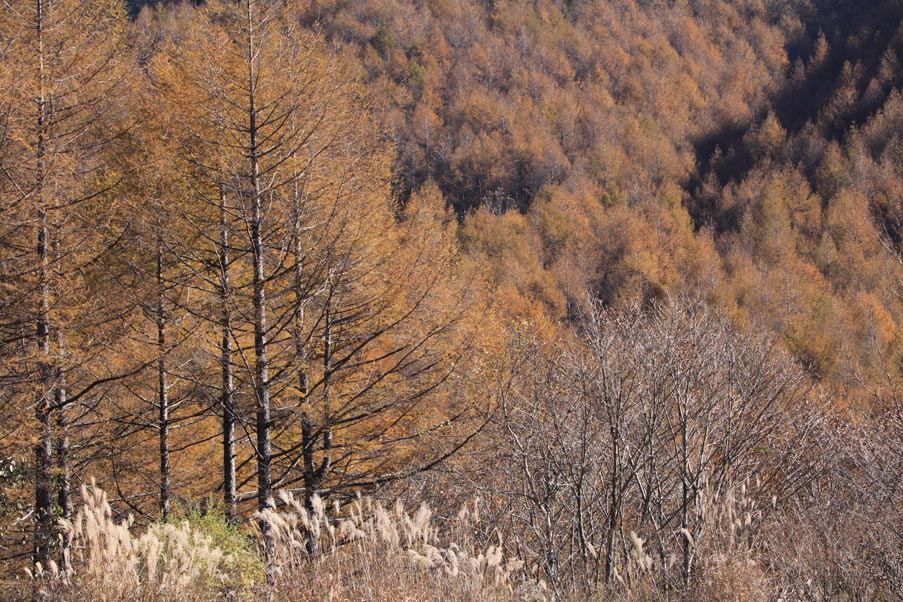 つづいて向かうは権兵衛峠 トンネルが出来てからたぶん訪れる人も、ほとんどなくなった であろう、木曽路と伊奈路をつなぐ旧道の峠越え。 落葉松林がきれいだった、昔の印象をたよりに・・ |